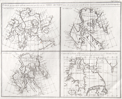 Marvelous set of four maps of the Hudson, Button and Baffin Bay regions, Davis Straits and the Coast of Labrador, showing the evolution of the mapping and discoveries of these regions, as they were explored and mapped between 1650 and 1750. This map was one of ten maps in Diderot's important 10 volume encyclopedia, one of the most important general compendiums of information of its time. It includes the work of Sanson (1650), De L'Isle (1700 and 1703) nd Henri Ellis (1746-1747).