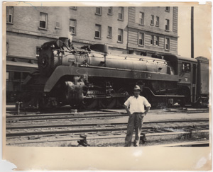 [man posing with #5442 train in background]