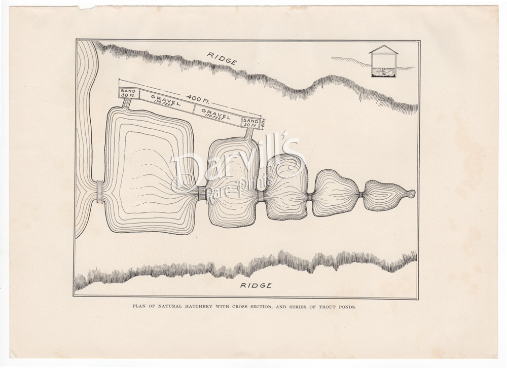 Plan of natural hatchery, with cross section and series of trout ponds |