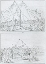 George Catlin's paintings comprise the first important pictorial record of the Plains Indians and their then little-known homelands west of the Mississippi River. "Catlin's Indian Gallery," as the dedicated artist himself called it, consisted of hundreds of portraits of Indians, scenes of Indian life, and landscapes of a wilderness scarcely changed through the millennia. In his notebooks and on canvas, the young Pennsylvania lawyer captured much of an American that was swept away a century ago by the westward-pressing settler. Catlin made these dramatic paintings on a series of journeys into largely unmapped Indian country between 1830 and 1836. For the first time, Americans in the eastern states saw the Pawnees, the tall Blackfeet and Crows, the Sioux, and the wild Comanches. They saw wide prairies teeming with buffalo, the turbulent Missouri River, and the giant grizzly bear. They saw villages of hundreds of graceful teepees and peered into the dim interiors of comfortable earth lodges, and witnessed the four-day torture ceremony of the Mandans. The Plains Indians of Catlin's portraits were still proud and dignified, unlike their cousins on eastern reservations. Freed by the acquisition of the horse from the restrictions of hunger and scarcity, they were riding the crest of a new richness and power. But they, too, were fated to lose in the encounter with western civilization—and Catlin knew it. "Art may mourn when these people are swept from the earth," he wrote, "and the artists of the future ages may look in vain for another race so picturesque in their costumes, their weapons, their colours, their manly games, and their chase...." [ref.: "Letters and Notes..." introduction by Marjorie Halpin (Dover, 1973).] |