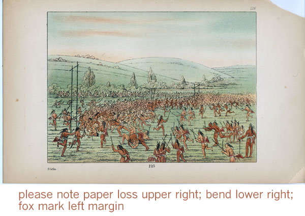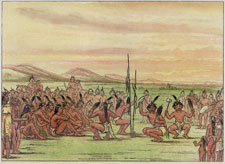 George Catlin's paintings comprise the first important pictorial record of the Plains Indians and their then little-known homelands west of the Mississippi River. "Catlin's Indian Gallery," as the dedicated artist himself called it, consisted of hundreds of portraits of Indians, scenes of Indian life, and landscapes of a wilderness scarcely changed through the millennia. In his notebooks and on canvas, the young Pennsylvania lawyer captured much of an American that was swept away a century ago by the westward-pressing settler. Catlin made these dramatic paintings on a series of journeys into largely unmapped Indian country between 1830 and 1836. For the first time, Americans in the eastern states saw the Pawnees, the tall Blackfeet and Crows, the Sioux, and the wild Comanches. They saw wide prairies teeming with buffalo, the turbulent Missouri River, and the giant grizzly bear. They saw villages of hundreds of graceful teepees and peered into the dim interiors of comfortable earth lodges, and witnessed the four-day torture ceremony of the Mandans. The Plains Indians of Catlin's portraits were still proud and dignified, unlike their cousins on eastern reservations. Freed by the acquisition of the horse from the restrictions of hunger and scarcity, they were riding the crest of a new richness and power. But they, too, were fated to lose in the encounter with western civilization—and Catlin knew it. "Art may mourn when these people are swept from the earth," he wrote, "and the artists of the future ages may look in vain for another race so picturesque in their costumes, their weapons, their colours, their manly games, and their chase...." [ref.: "Letters and Notes..." introduction by Marjorie Halpin (Dover, 1973).] |