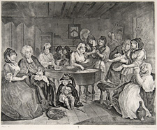 Moll, dead at the age of twenty-three, is being waked. The plate on her coffin reads: "M. Hackabout Died Sepr 2d 1731 Aged 23." Nobody mourns her passing at the mock vigil held for her. Leading lives that are without options, her sisters have little to learn from her death. Gathered around her coffin, they exhibit a variety of contrasting attitudes toward the occasion. Their spiritual leader, the clergyman (identified by Hogarth as "the famous Couple-Beggar in The Fleet"), who is supposed to give a religious tone to the event, has his hand up the skirt of the girl beside him. his venereal preoccupation causes him to spill. The face of the girl who covers his exploring hand with a mourning hat is filled with a look of dreamy satisfaction.
