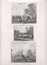 Original chine colleé etchings nearly 200 years old. (Chine collé method: Chine refers to thin tissue paper, traditionally imported from China, Japan and India. Collé refers to the glue or paste used to attach this thin tissue to heavier Western-made plate paper. The smooth surface of the Oriental tissue papers accepts finer printing detail than the more coarsely textured plate papers. Tissue papers are, however quite weak. Pasting them to thicker paper gives them strength and stability.)