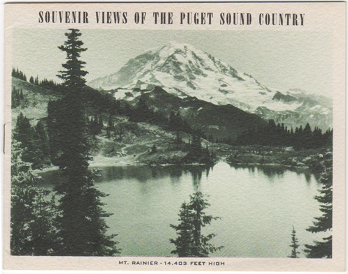 A small booklet of 16 pages with blue/green toned photos of Puget Sound views. The pages are printed both sides. Views include: Mt Rainier (front cover shown above), Volunteer Park Art Museum, Lower End Hood Canal, Pass-San Juan Islands, Government Locks - Seattle, Lake Washington Floating Bridge, Mt. Shuksan-Mt Baker National Forest, Sailing Ship on Puget Sound, Sailboats on Puget Sound, Airview of Tacoma, Ferry enroute Seattle to Bremerton, University of Washington, A Clallam Indian adzing a canoe, State of Washington Map (back cover shown right). Original mailing envelope included. |