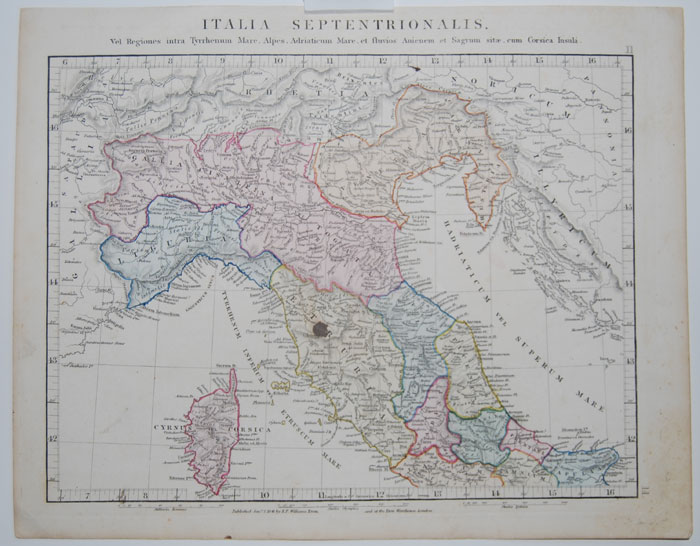 Good: per usual, light age toning to edges; somewhat grubby margins; rather large fox mark (ink spot?) in Etruria area; very faint watercolor drops in Adriatic Sea